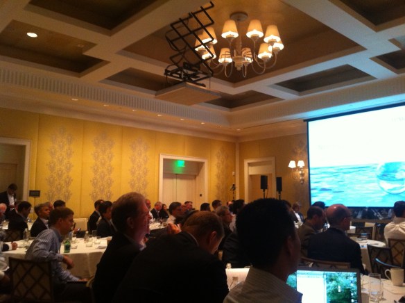 Sigh – besides the lovely ladies who handed me my badge when I arrived, other women were quite scarce – the typical VC Partner/High Tech CEO crowd. At least there was no line for the restroom.